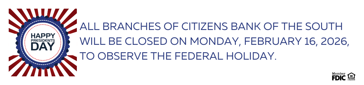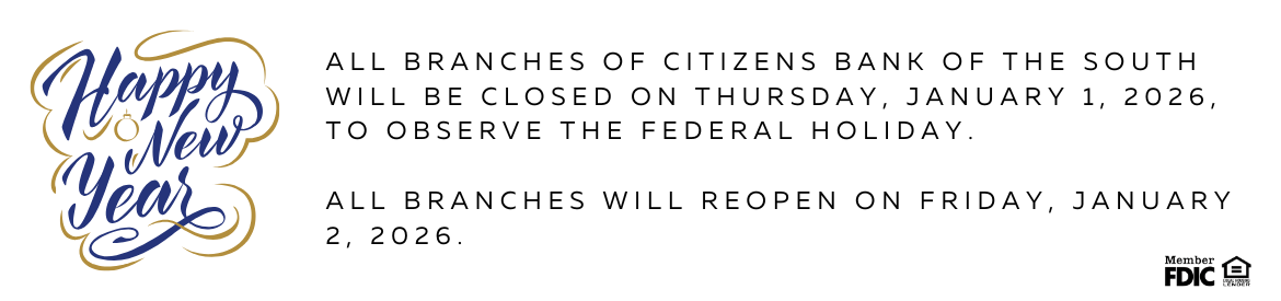 Although Citizens Bank of the South has changed considerably over the past several decades, CBOTS is committed to its loyal customers, prudent growth, and personal and professional service. We invite you to browse our newly branded website, visit any of our four convenient locations, or give our friendly customer service representatives a call at 1-877-99-CBOTS. You’re sure to find an array of options that can be tailored to fit your lifestyle. That’s Simple Banking, Your Way.