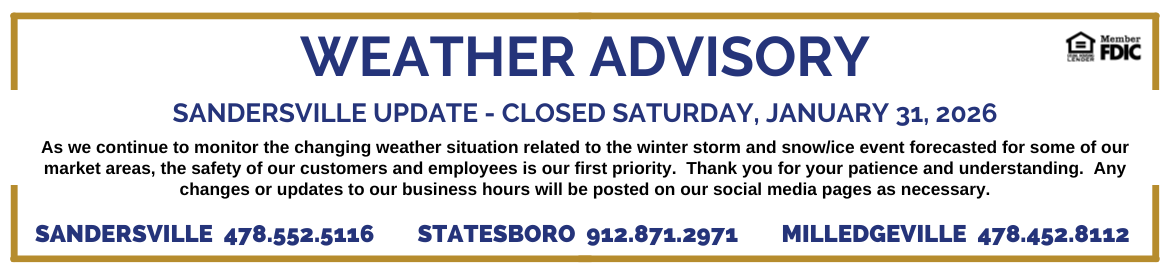 Saturday Only: The Sandersville Main Office Drive-Thru located at 132 S Harris St is open Saturdays 9:00am-12:00pm