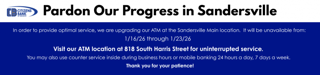Saturday Only: The Sandersville Main Office Drive-Thru located at 132 S Harris St is open Saturdays 9:00am-12:00pm