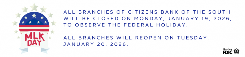 Although Citizens Bank of the South has changed considerably over the past several decades, CBOTS is committed to its loyal customers, prudent growth, and personal and professional service. We invite you to browse our newly branded website, visit any of our four convenient locations, or give our friendly customer service representatives a call at 1-877-99-CBOTS. You’re sure to find an array of options that can be tailored to fit your lifestyle. That’s Simple Banking, Your Way.